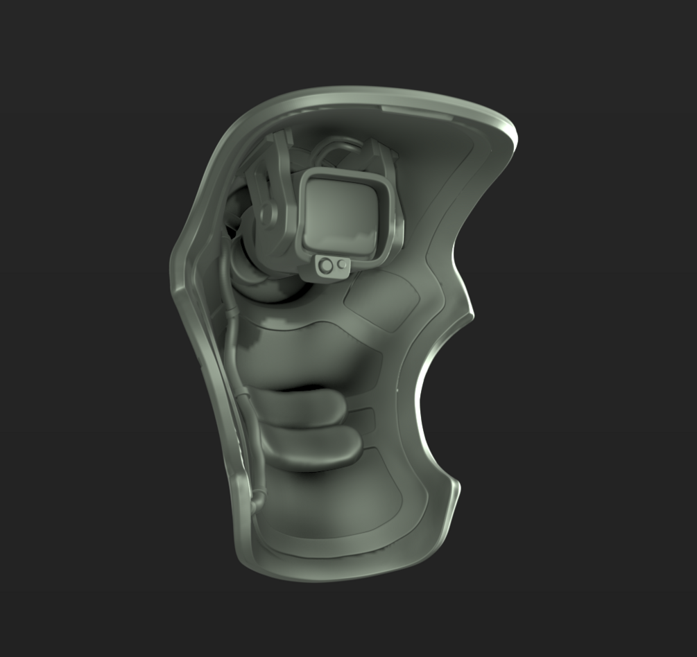 Interior details (seat, cushioning, cables, monitor)