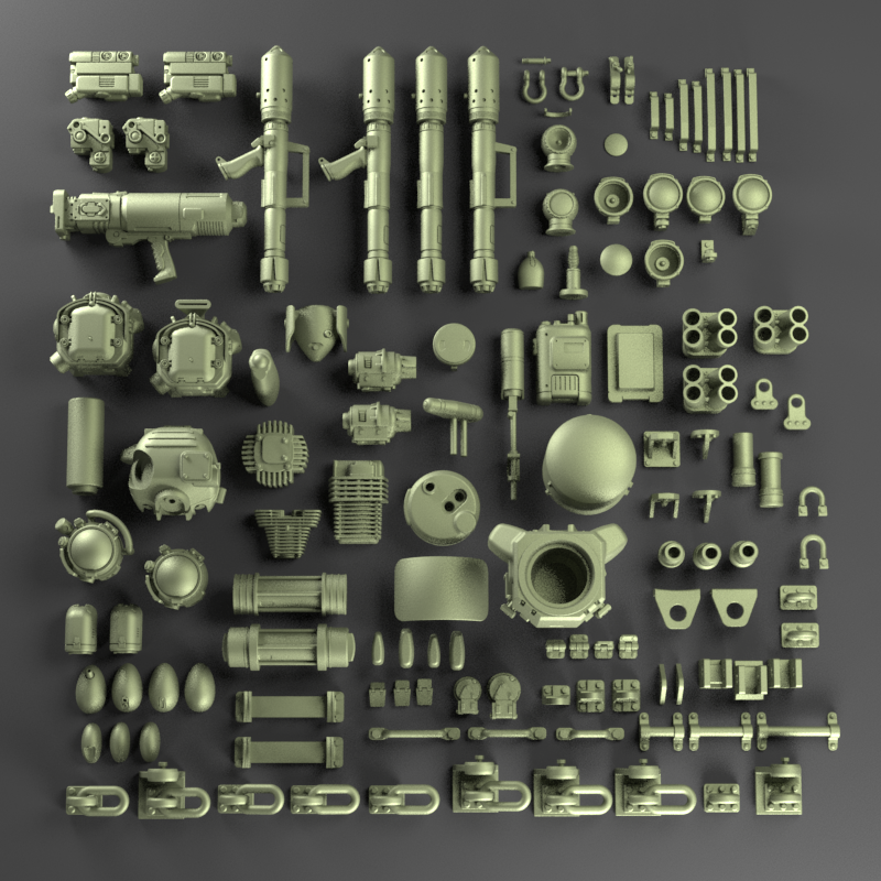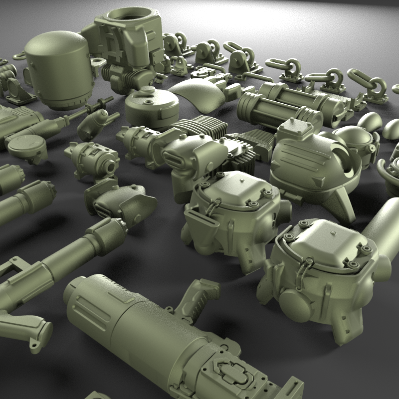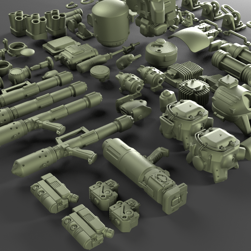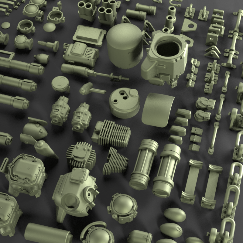 This pack consists of all kinds of cool parts to customize your 1/20 kits. Hinches, antenna's, bars, rings, clasps, engine packs, radiators and various pew pew sticks!